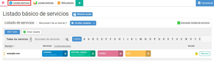 Para acceder desde el listado de dominios debes pulsar en la opción Listado dominios del menú superior en el listado básico de servicios.