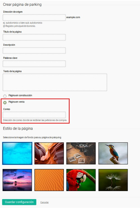 Una vez cumplimentado el formulario puedes seleccionar el estilo de página que más te guste. En el caso de que selecciones la opción Página en venta se mostrará un campo más para indicar la dirección de correo donde se recibirán las peticiones de compra.