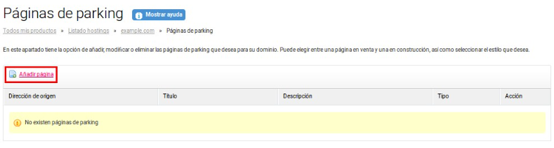 Una vez has accedido a la gestión de la página de parking, estarás en la siguiente pantalla, donde puedes añadir una página de parking pulsando en la opción Añadir página.