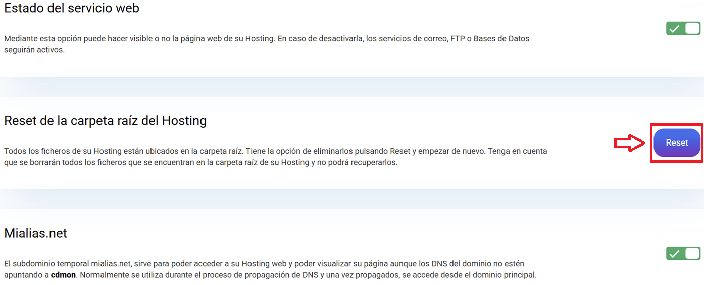 En la sección 'Información del alojamiento', tienes distintos apartados con información y acciones para realizar sobre la gestión del alojamiento. En el apartado 'Reset de la carpeta raíz del alojamiento' debes pulsar en Reset.