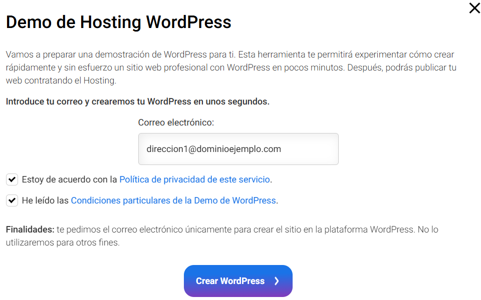 Aparecerá un mensaje explicativo titulado Demo de Hosting WordPress. En este mensaje debe introducir un correo electrónico. Esto es necesario para asociar el sitio de prueba al instalador, pero no se utilizará para otros fines.