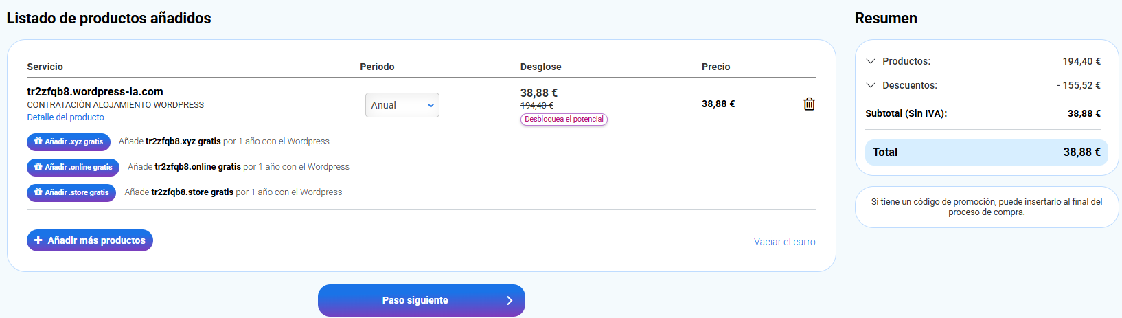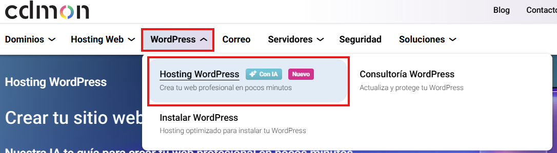 Si decides contratar el hosting, haz clic en Contratar y publicar mi web, lo que te redirigirá al proceso de compra de nuestra web comercial.