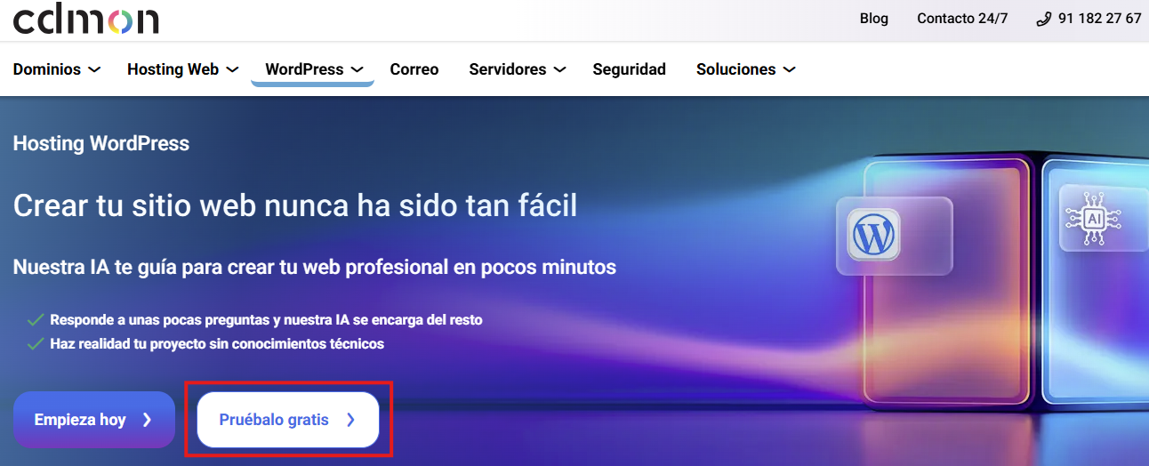 Con nuestra demo del Hosting WordPress puedes probar la herramienta de Inteligencia Artificial que simplifica la creación de sitios web, sin necesidad de registrarte ni contratar el servicio para hacer esta prueba. Aquí te mostramos cómo hacerlo paso a paso:
