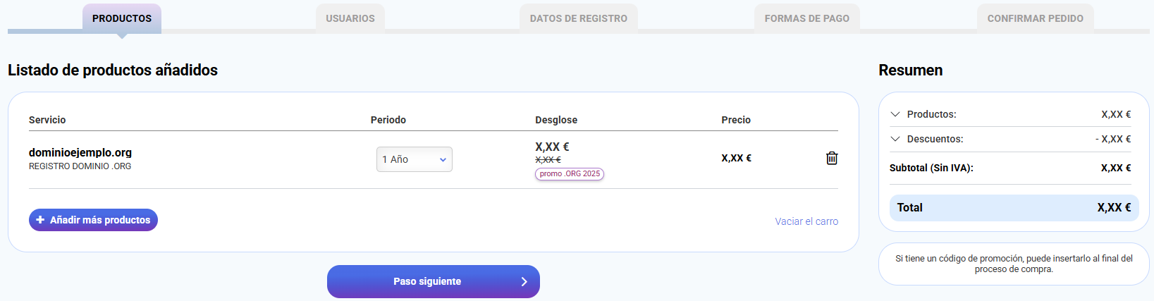 El producto ya se habrá añadido al carrito de la compra, si accedemos a este podremos ver que ya podemos proceder con el pago del registro: