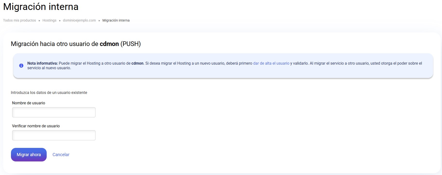 Pasarás a una pantalla donde tienes que introducir el nombre del usuario al que quieres pasar el alojamiento. Tienes que introducir el nombre dos veces, una en el campo 'Nombre de usuario' y otra en el campo 'Verificar el nombre de usuario' y pulsar en la opción Migrar ahora.