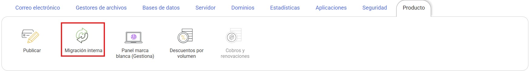 En la opción de Migración interna que aparece en la sección de 'Producto' del panel de gestión del alojamiento, puedes realizar distintas operaciones para transferir hosting.