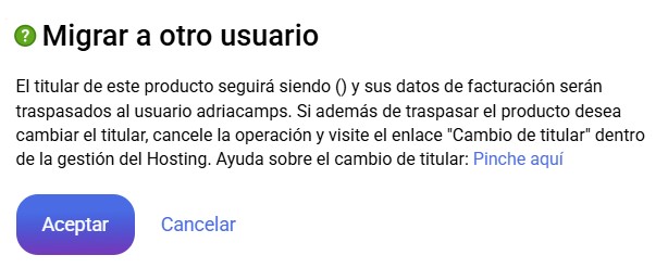Aparecerá una ventana indicando que el hosting seguirá teniendo el mismo titular y los datos de facturación serán traspasados al usuario en cuestión.