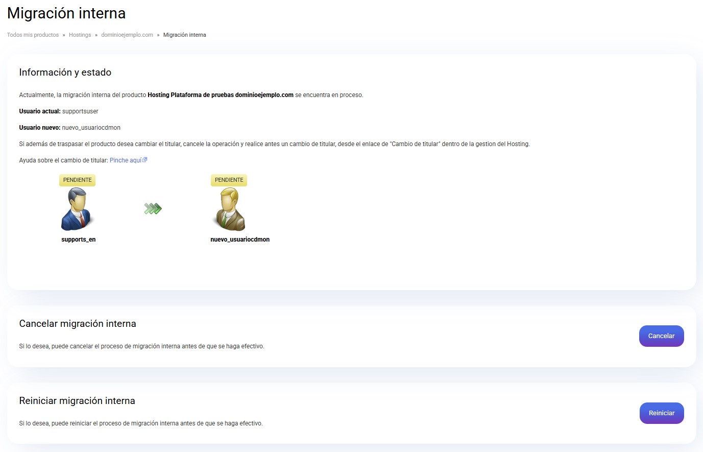 Si accede nuevamente a la Migración interna des de el panel de control puede ver el estado en el que está la migración. También tiene la opción de cancelar o reiniciar la migración, por si alguno de los dos usuarios no ha recibido el correo de aceptación.