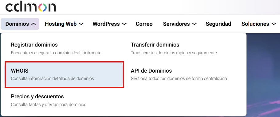 Para poder hacer una búsqueda whois, debe acceder a nuestra página principal cdmon.com, en el apartado de "Dominios" y clicar sobre "Buscador WHOIS"
