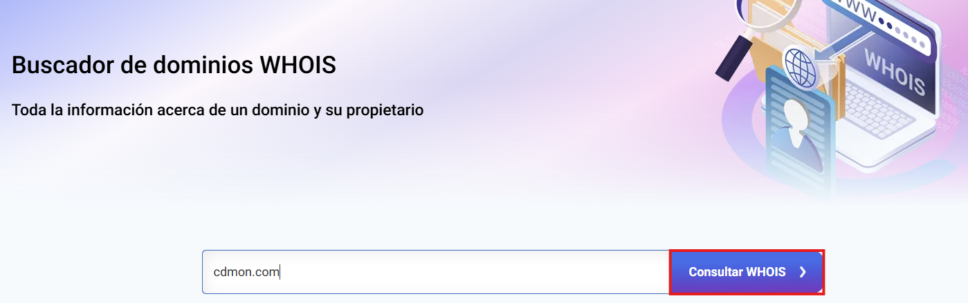 Seguidamente, deberá introducir el nombre del dominio que quiere ver la información. En este ejemplo, lo hemos hecho con cdmon.com: