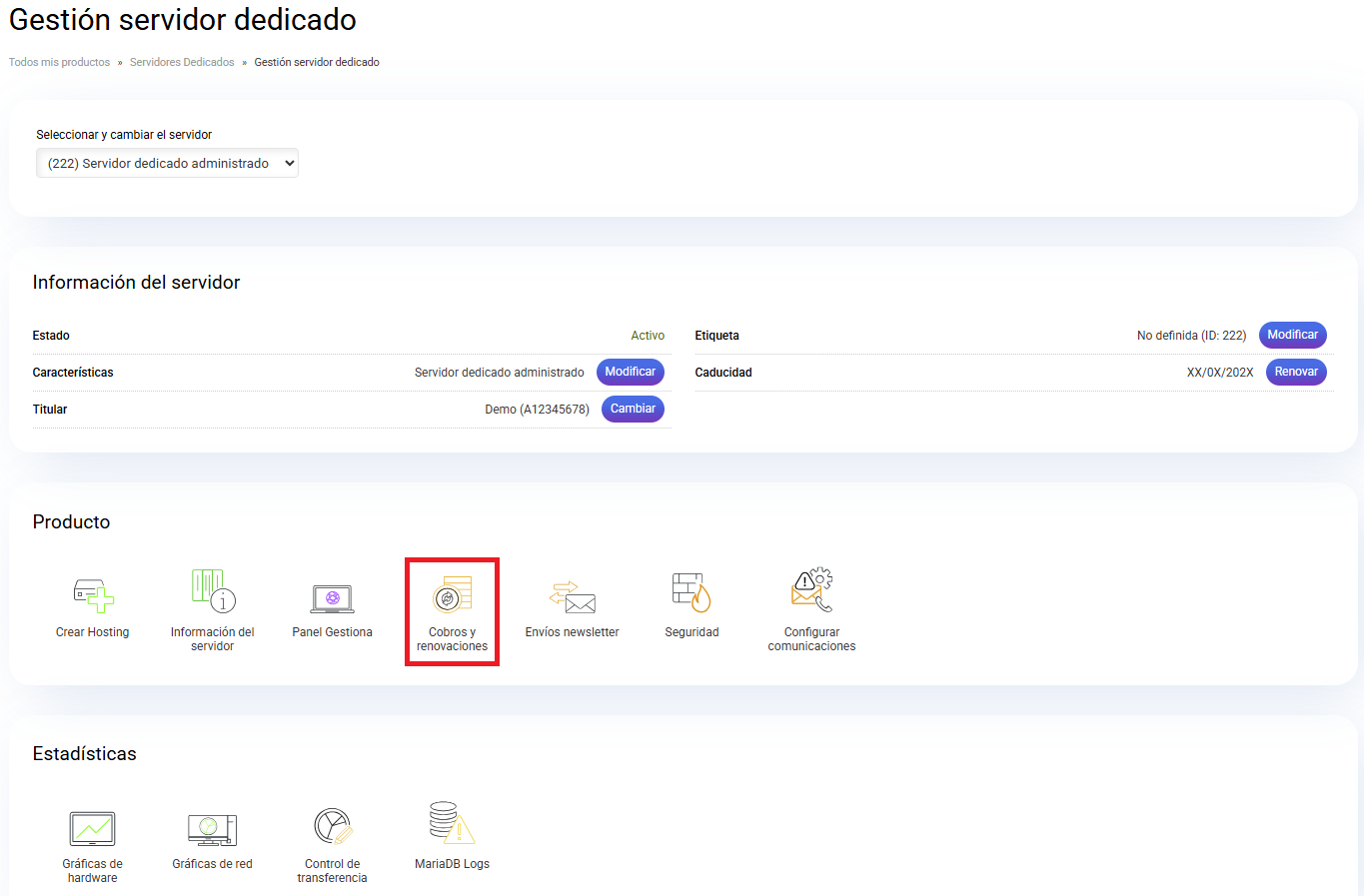 Para poder tener un control de los pagos y renovaciones de tu servidor dedicado, debes acceder a la gestión del dedicado desde tu panel de control de cdmon y pulsar en la opción Cobros y renovaciones.