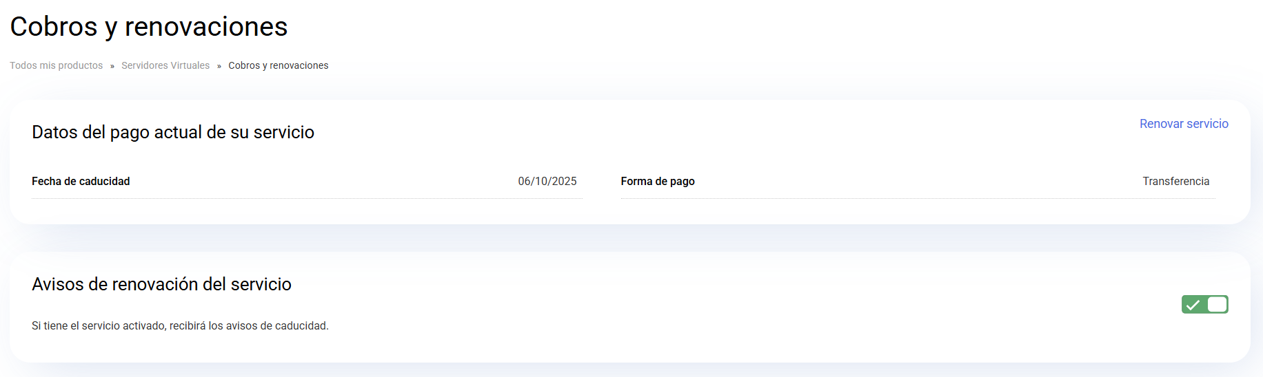 - Forma de pago: Tipo de pago seleccionado para la renovación de tu servidor dedicado.