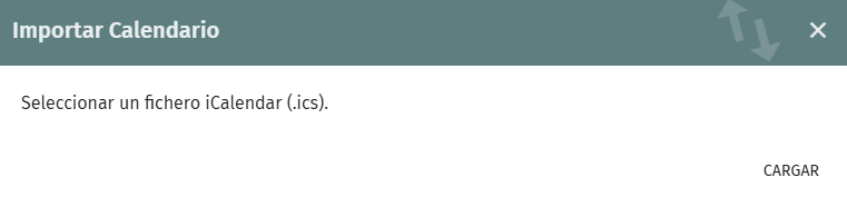 - Aparecerá una ventana donde podrás seleccionar el archivo. Haz clic en el botón Cargar, y selecciona el fichero .ics exportado anteriormente desde Roundcube.