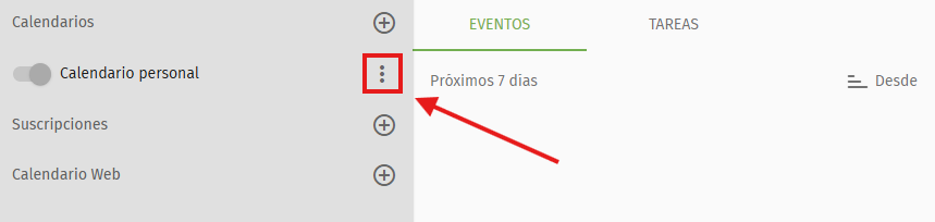 - Selecciona la opción Calendario personal y haz clic sobre el icono de los tres puntos verticales que aparece a su derecha. Si no te aparece ninguno o lo has eliminado sin querer, puedes crear uno nuevo: