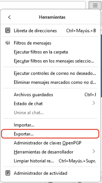 Seguidamente, le aparecerán todas las herramientas que tiene la aplicación de Thunderbird. Debe clicar sobre la opción de Exportar.. . para iniciar el proceso.