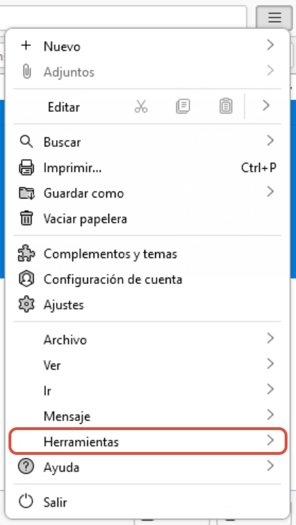 Para poder importar correo a una cuenta configurada en la aplicación de Thunderbird, es necesario disponer de un archivo comprimido de todos los correos. Para realizar la importación, deberá clicar sobre el botón de " Menú " que se encuentra en la parte superior derecha y clicar sobre Herramientas: