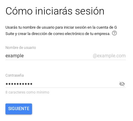 A continuación tendrás que introducir un nombre de usuario y contraseña para iniciar sesión en Google G Suite. El nombre de usuario será una cuenta de correo de tu propio dominio, como puedess comprobar en la siguiente imagen.