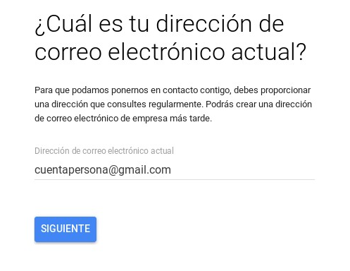 Tras especificar la ubicación tendrás que facilitar una cuenta de correo que consulten regularmente (una cuenta personal). Podrás crear una cuenta de empresa más adelante.