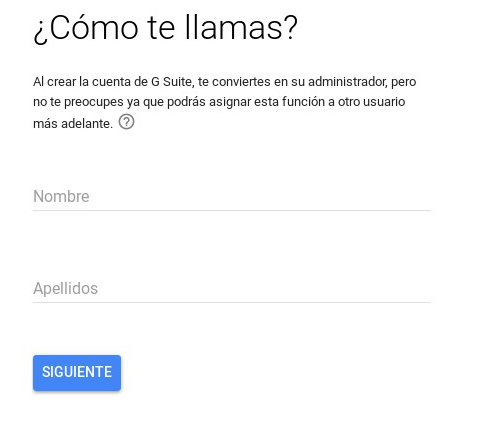 Al crear la cuenta G Suite, te conviertes en su administrador, es por ello que te pedirá nombre y apellidos. Pero no te preocupe, ya que podrás asignar la función de administrador a otro usuario una vez creada la cuenta.