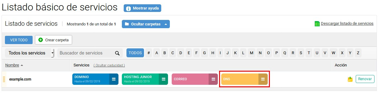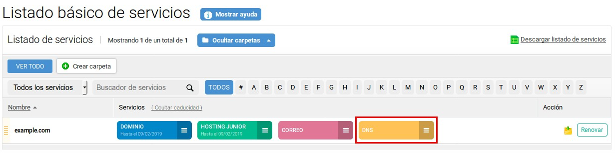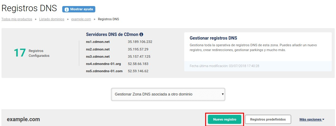 Accede a la gestión del registro DNS desde la página principal del panel de control de cdmon, desde la opción DNS de tu dominio.