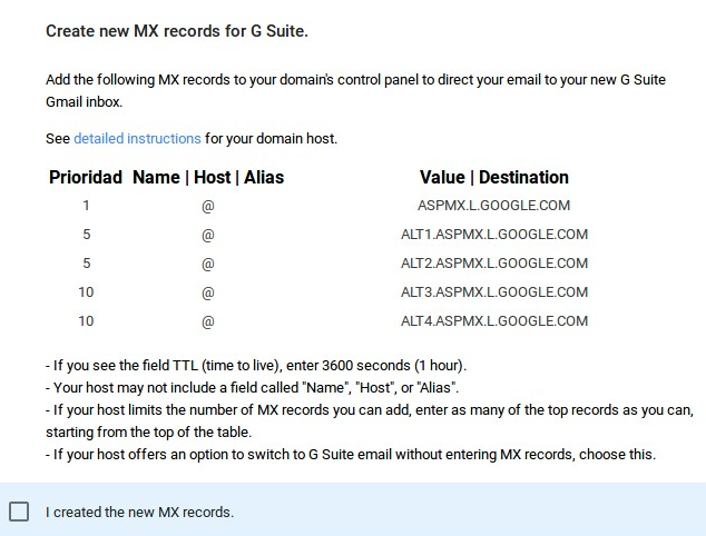 Pasados unos 5 minutos, vuelve a las opciones de configuración de Google G Suite y acepta los pasos restantes como; I created the new MX records, He eliminado los registros MX existentes y I saved the MX records, y pulsa la opción Verificar el dominio y configurar el correo.