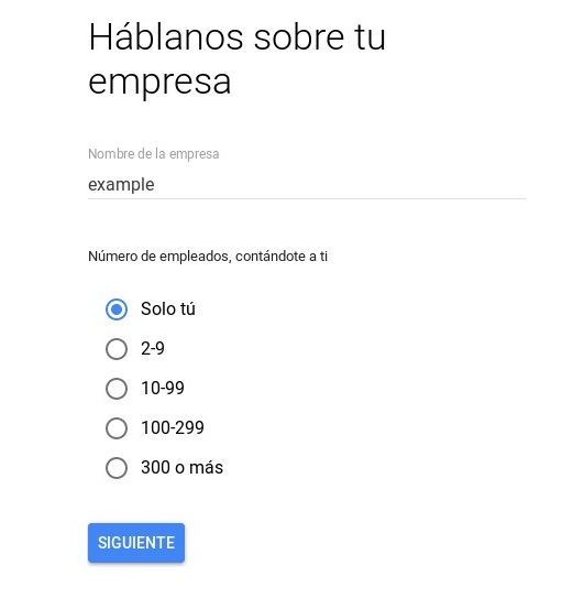 En esta primera parte verás como obtener una cuenta de Google G Suite. En la primera pantalla, en el alta de la cuenta, debes facilitar una serie de datos básicos de tu organización/empresa como; nombre de la empresa y número de trabajadores.