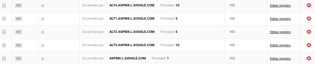 Una vez aceptada la asignación de los registros MX de Google G Suite, puedes comprobar en la gestión de los registros que se han creado correctamente los registros MX.