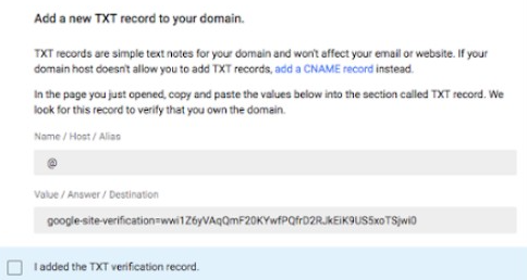 Ya creada la cuenta de G Suite podrás ver la siguiente pantalla, donde podrás añadir a personas a la cuenta G Suite, verificar el dominio y configurar el correo electrónico. Tienes que escoger la opción Verificar tu dominio y configurar el correo electrónico. En este paso hay que demostrar la propiedad del sitio.