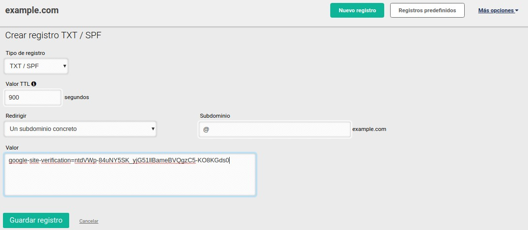 En esta opción se te da una serie de caracteres que inician con google-site-verification, tienes que copiarlo y ves a la opción de configurar el registro TXT en tu panel de control de cdmon.