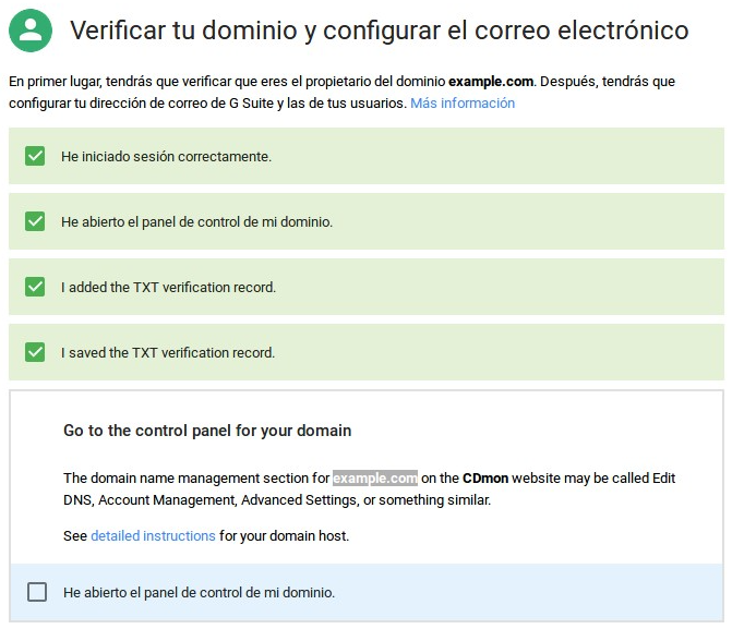 Una vez guardado el registro vuelve a la Verificación de dominio y configuración de correo de Google G Suite. Verificar los pasos realizados anteriormente; I added the TXT verification record y I saved the TXT verification record. Una vez verificado los pasos anteriores tienes que aceptar la opción He abierto el panel de control de mi dominio.
