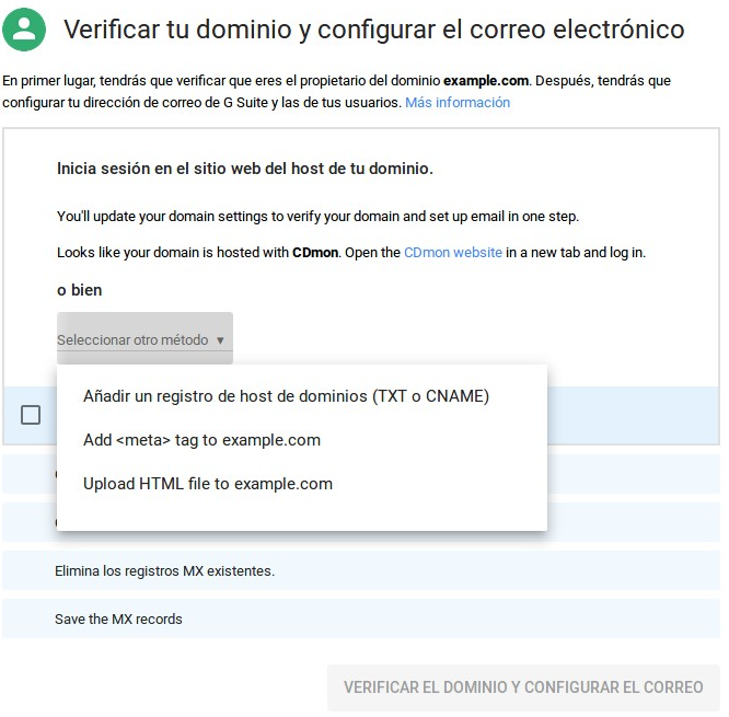 En la siguiente pantalla escoge el método de verificación del dominio. Cdmon recomienda la opción Añadir un registro de host de dominios (TXT o CNAME).