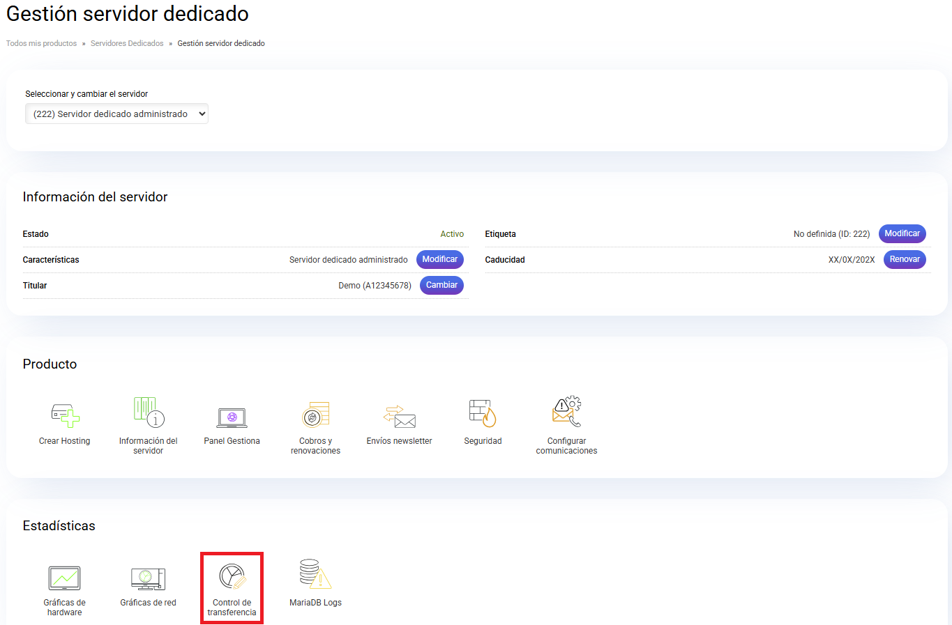 Para tener un control y poder gestionar la transferencia de tu servidor Dedicado Administrado, como de los alojamientos que tengas creados en el servidor, debes acceder a la gestión del Dedicado desde tu panel de control de cdmon y pulsar en la opción Control de transferencia.
