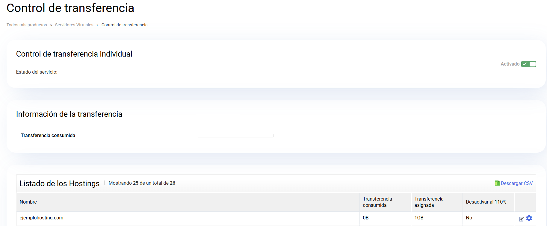 Con el "Control individual activo" aparece la lista de los alojamientos creados en el servidor Dedicado Administrado. Donde podrás asignar la transferencia que requieras a cada alojamiento.
