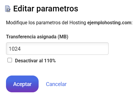 En la información se nos mostrará la "Transferencia consumida", la "Transferencia asignada" y si está habilitada la opción de desactivar el alojamiento al superar el 110% de la transferencia.