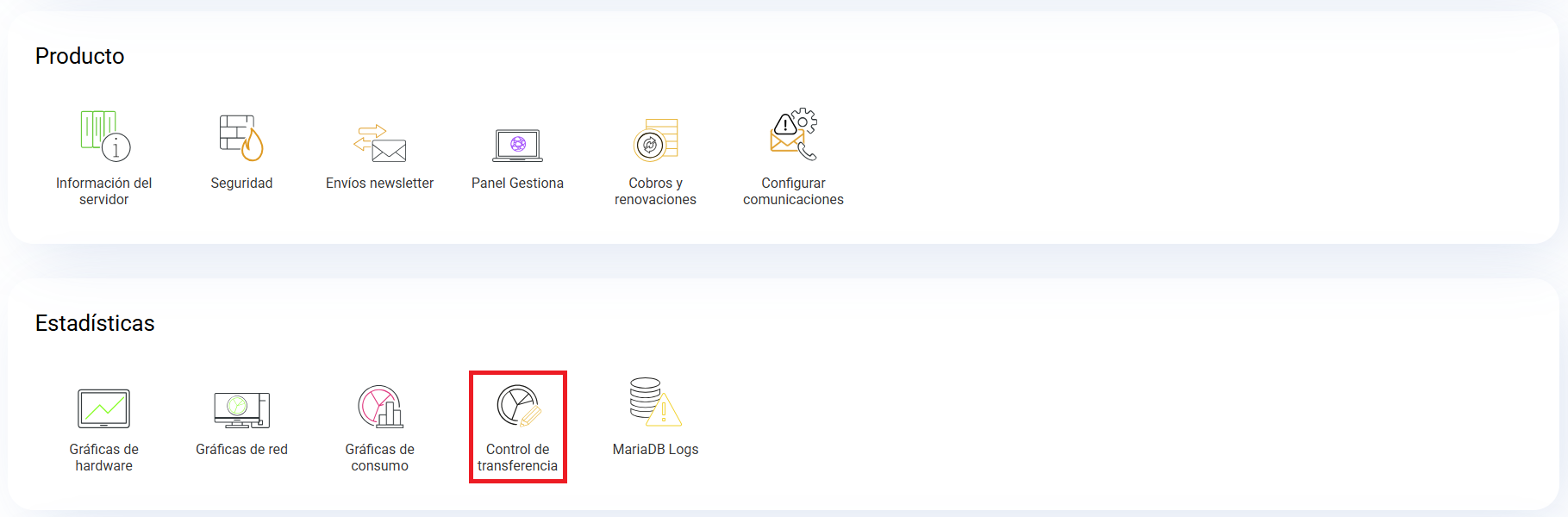Para tener un control y poder gestionar la transferencia de tu servidor Virtual, como de los alojamientos que tengas creados en el servidor, debes acceder a la gestión del Virtual desde tu panel de control de cdmon y pulsar en la opción Control de transferencia.