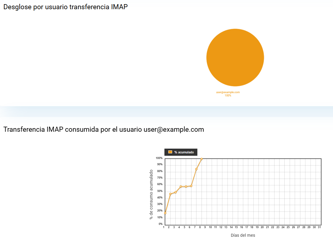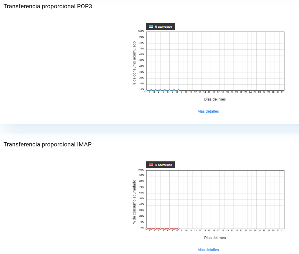 Si pulsas en la opción Más detalles accedes a un desglose del consumo de transferencia por POP3/IMAP especificado por cada usuario de correo creado, tal y como se muestra en la imagen inferior.