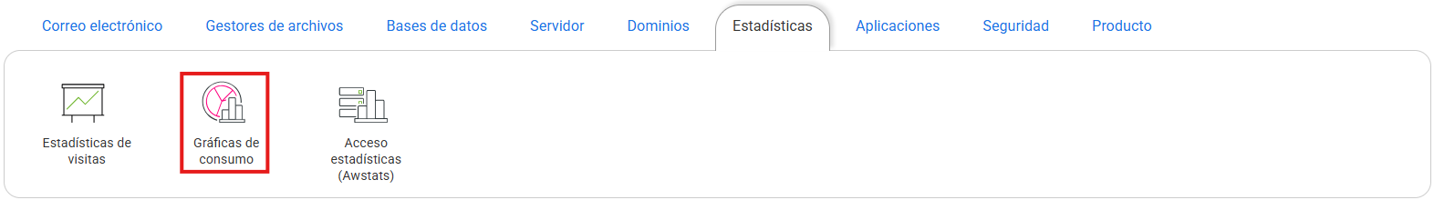 En el panel de control del alojamiento puedes revisar distintos datos de consumo de tu alojamiento. Puedes revisar el espacio utilizado y la transferencia consumida, así como las solicitudes diarias que recibe tu alojamiento. Para ver toda esta información, debes acceder al icono de Gráficas de consumo, en el apartado de 'Estadísticas' del panel de control del alojamiento.