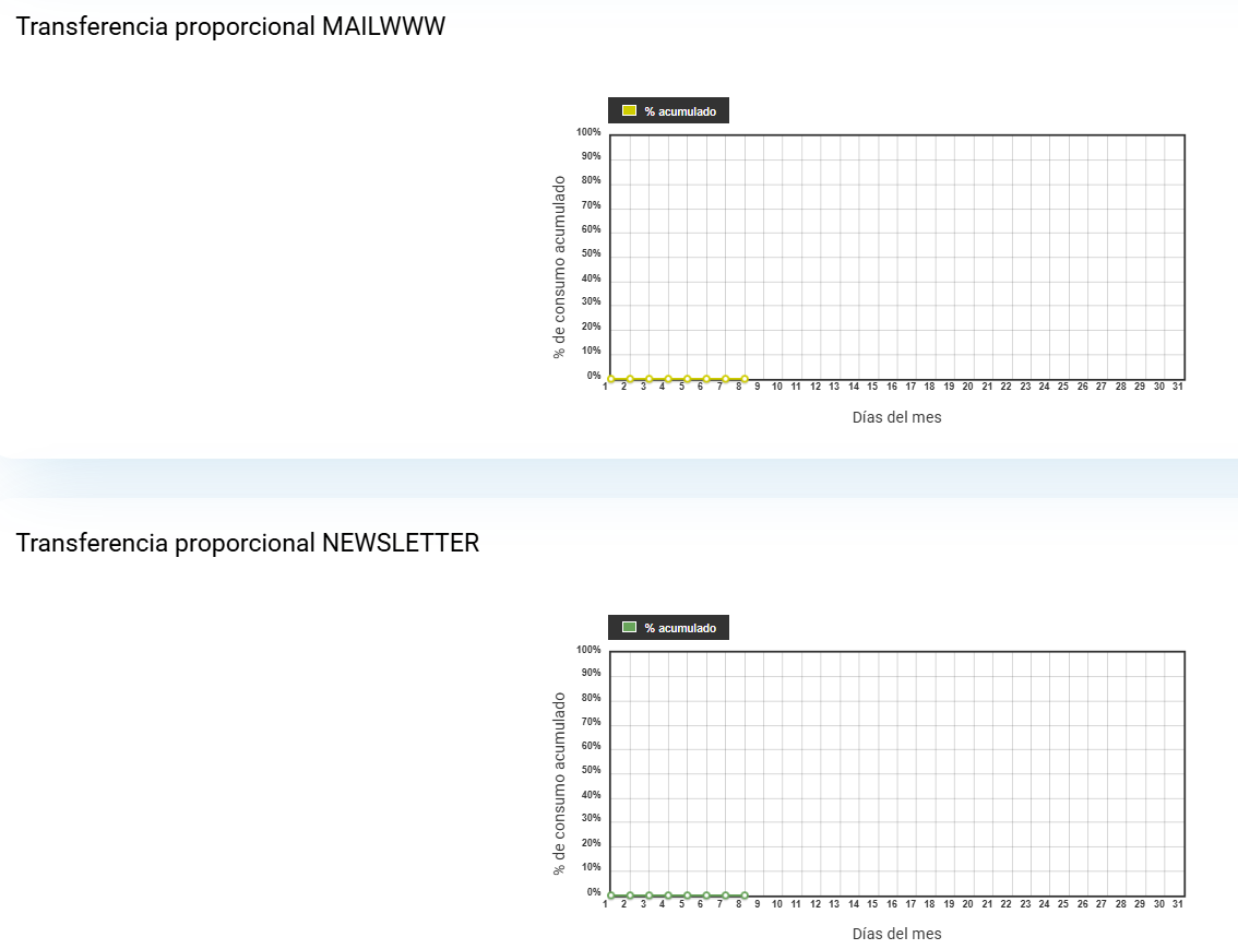 En esta opción puedes ver las gráficas de consumo generadas por el correo divididas en varias partes. El consumo de transferencia generado por la consulta y descarga del correo por POP e IMAP, el consumo de transferencia generado por el correo desde web y el consumo de transferencia generado por el Usuario newsletter y la aplicación mailman. y, también, el consumo generado por los envíos de correos a través de SMTP.