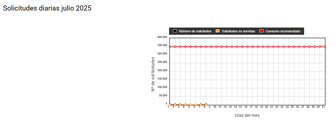 A través del siguiente gráfico puedes visualizar el número de solicitudes diarias generadas por tu alojamiento web. Dichas solicitudes son la suma de las solicitudes generadas por las visitas, bots de buscadores y páginas de errores. Se visualiza el valor generado diario y como límite, el número de solicitudes diarias recomendadas por dicho plan. Si deseas visualizar meses anteriores, tienes que usar los selectores y a continuación pulsar el botón Cargar. Tienes más información de qué es una solicitud en la página de soporte de Control de consumo del alojamiento web.