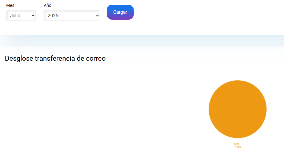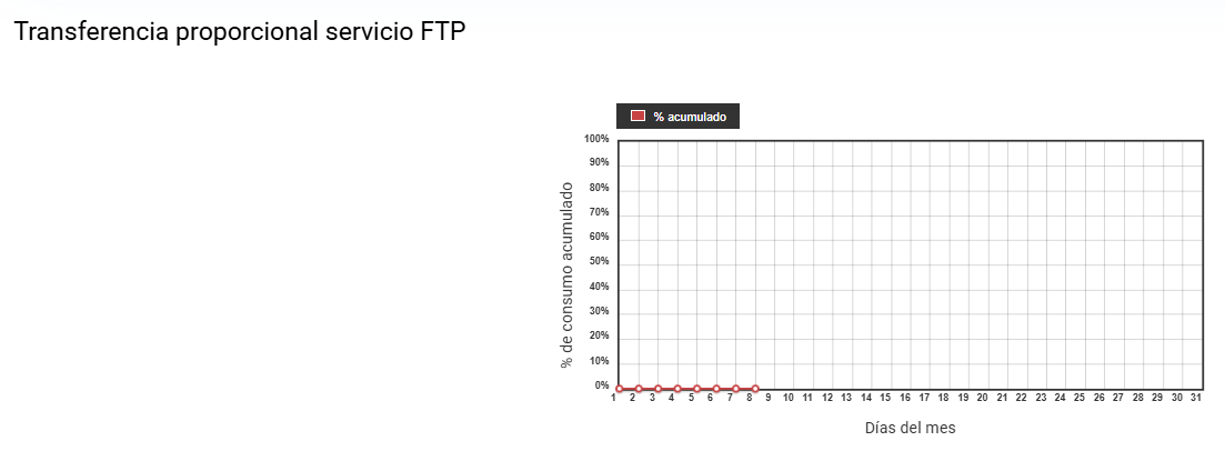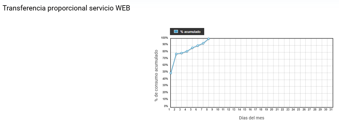 A través del siguiente gráfico puedes visualizar el volumen de transferencia consumida cada día. Se visualiza un sumatorio diario y como límite, el 100 % de transferencia contratada. Si deseas visualizar meses anteriores, puedes usar los selectores y a continuación pulsar el botón Cargar.