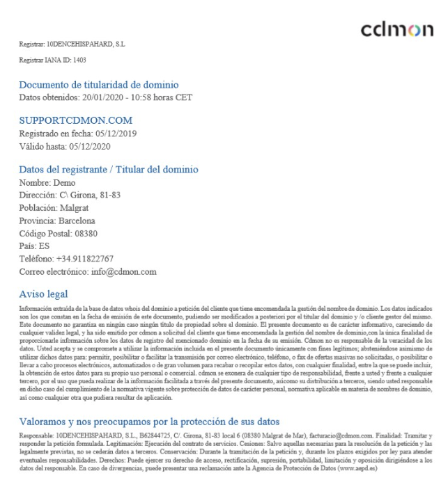 Al pulsar en dicha opción se descargará un documento cómo el que verás a continuación, con los datos que hay en la base de datos de Whois en el momento de emisión del documento, y en el que podrás ver el registrador, fecha del documento, el nombre del dominio y datos del titular.