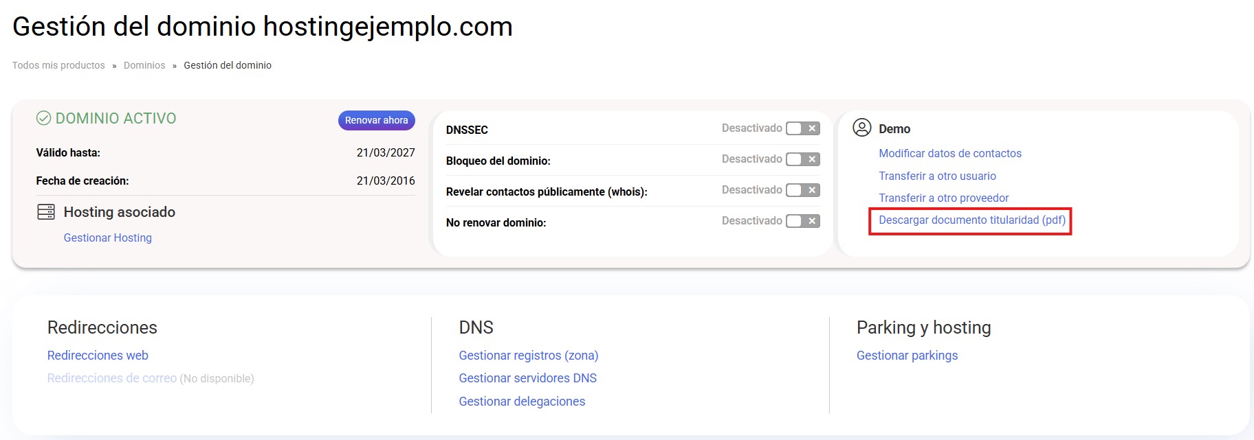 En la pantalla de gestión del dominio pulsa en la opción Descargar documento titularidad (pdf).