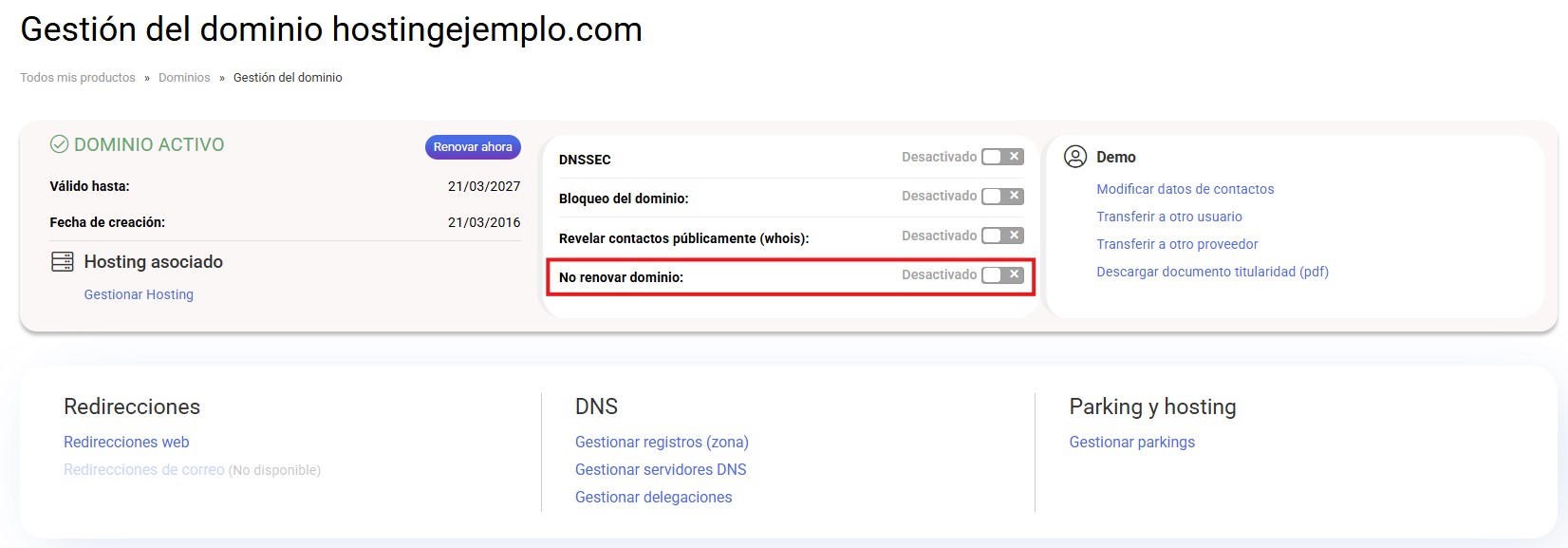No recomendamos que desactives los avisos de caducidad a menos que estés seguro de que no deseas renovar el dominio.