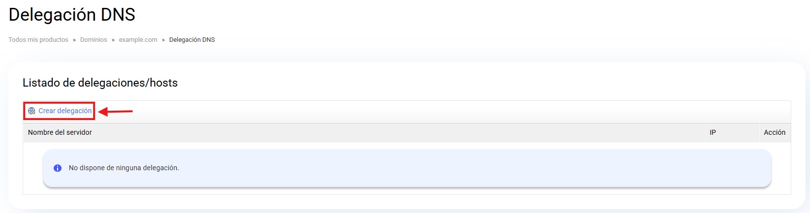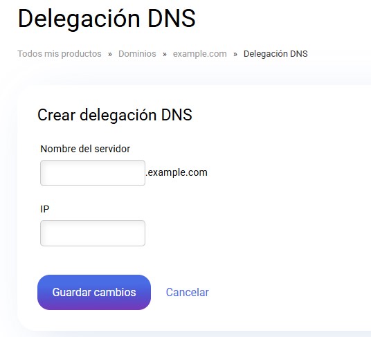 En el formulario "Crear delegación DNS" puedes crear los subdominios que serán dados de alta como registros de servidores DNS.