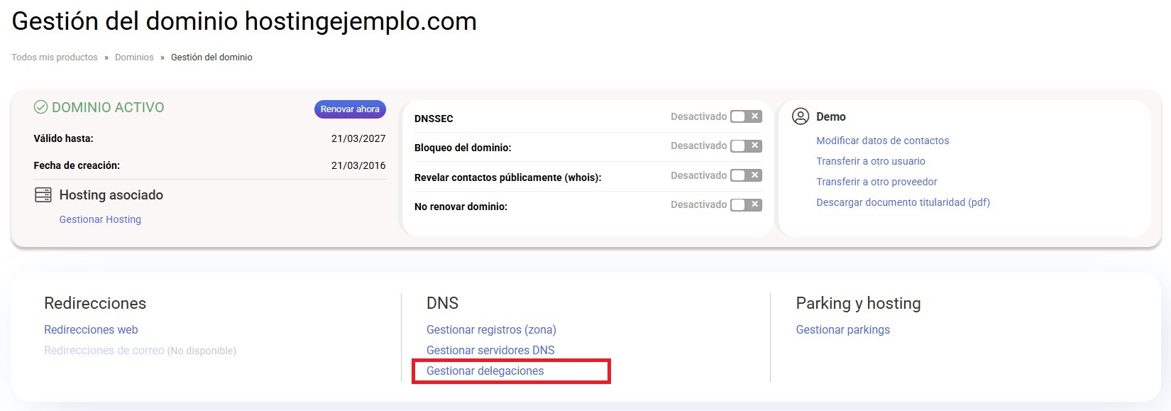 En la pantalla de gestión del dominio tienes que pulsar en la opción Gestionar delegaciones.