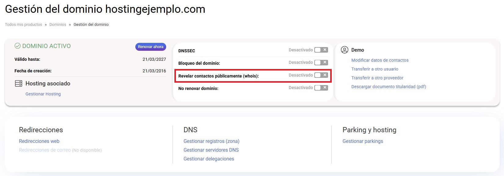 Gestión de dominio: Revelar contactos públicamente (whois)
