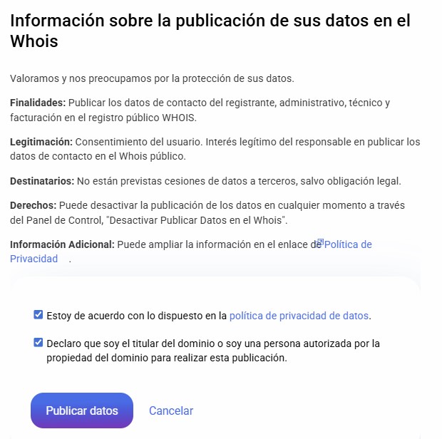 Al activar la opción "Publicar datos en el Whois" debes aceptar los términos para la publicación de los datos en el Whois.