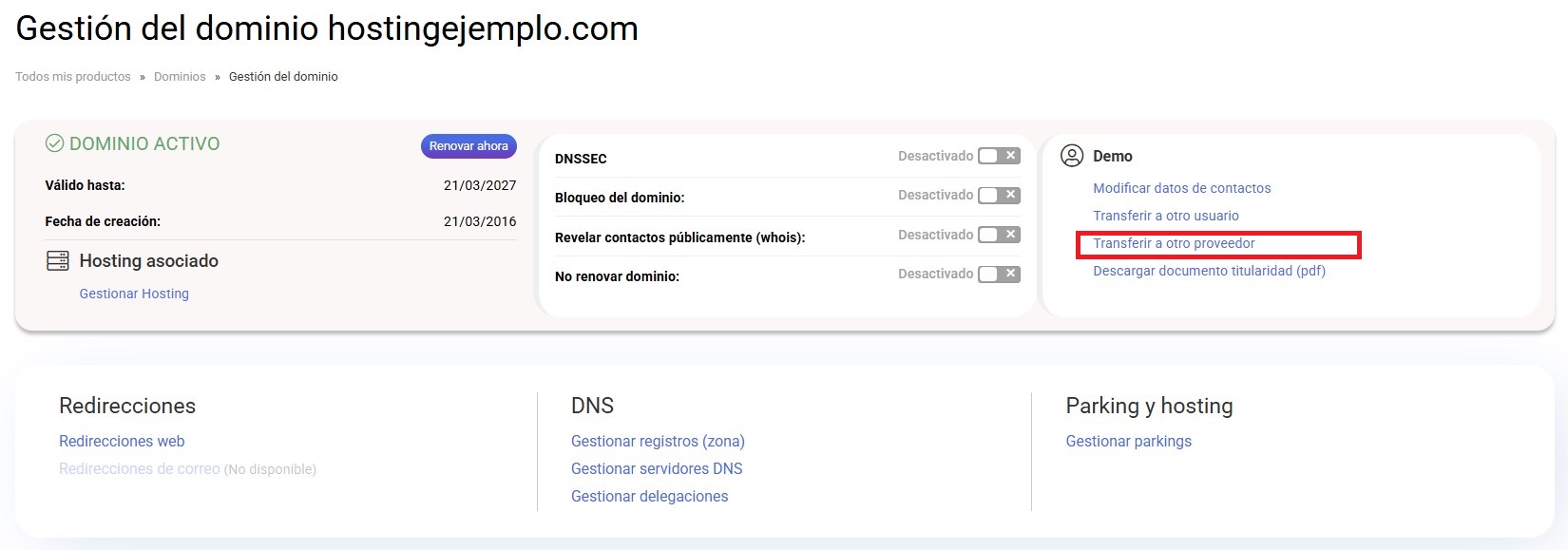 Dentro de la gestión de un dominio, para solicitar el AUTH CODE, pulsa en la opción Transferir a otro proveedor.
