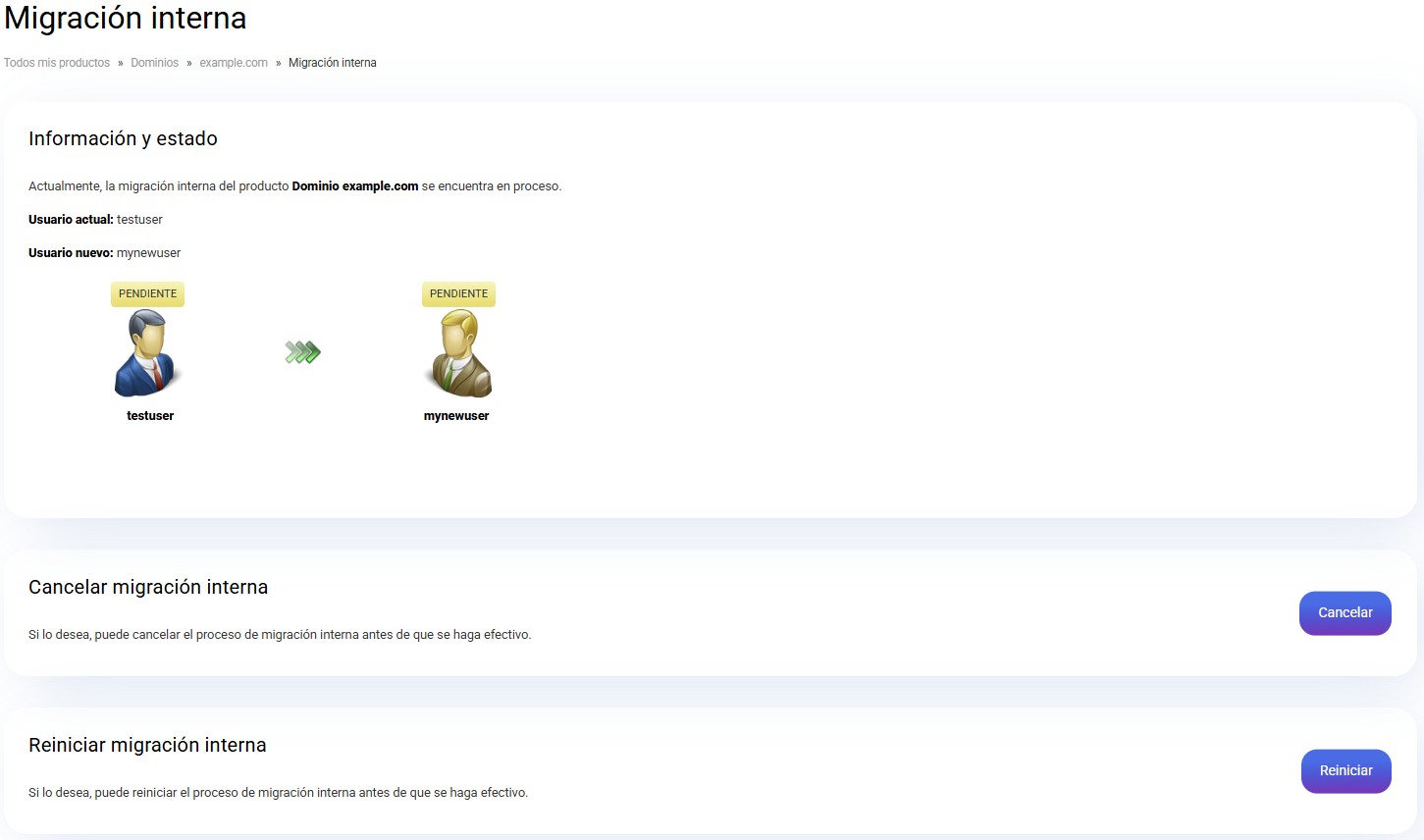 Si accede nuevamente a transferir el dominio a otro usuario desde la gestión de ese dominio, puede ver el estado en el que está la migración. También tiene la opción de cancelar o reiniciar la migración, por si alguno de los dos usuarios no ha recibido el correo de aceptación.