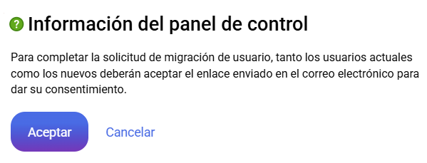 Una vez ambos usuarios den su conformidad, la migración se completará y se notificará a los usuarios por correo electrónico.